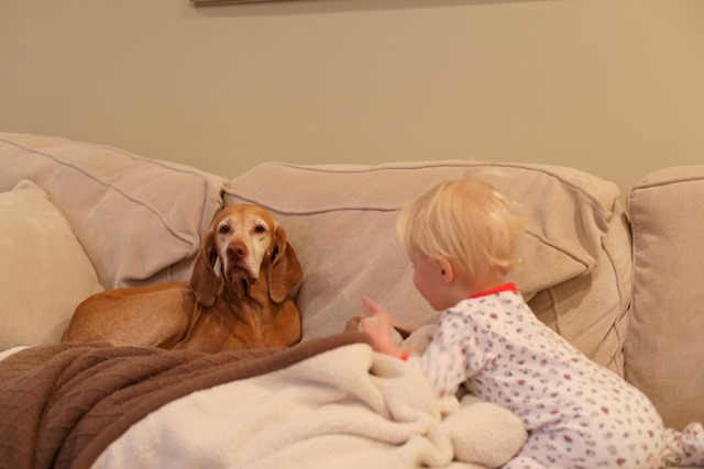 Sunday morning I woke up feeling pretty awful. Thankfully Chase was content to read books on the couch for most of the morning and play peek-a-boo with Sadie (who had no idea the game was going on around her).