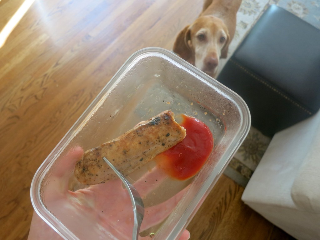 While Chase ate, I inhaled a banana with almond butter and a leftover hot Italian chicken sausage out of tupperware (<— aka my attempt not to dirty another dish) with some ketchup on the side because my mom snacks are oh so glamorous these days.
