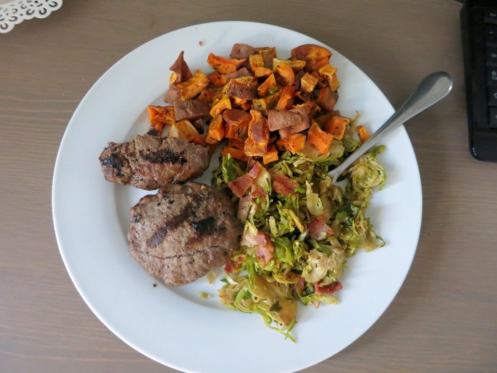 Burger + Shaved Brussels Sprouts Salad with Bacon + Roasted Sweet Potatoes