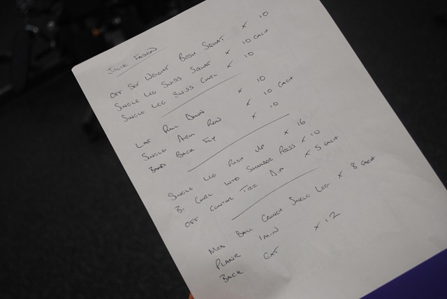Ben created a four-part circuit for me, with each part focusing on a different area of the body (legs, back, upper body, core).