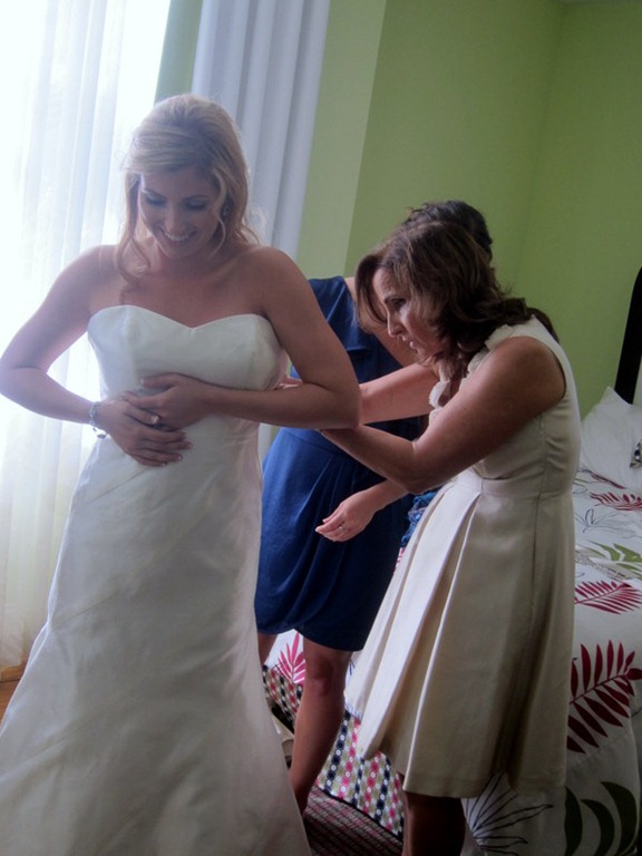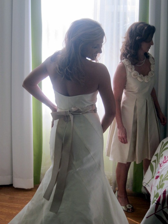 I arrived at the hotel a little before 10 a.m. and the day flew by. Before I knew it, 2:45 p.m. arrived and Leah’s wedding photographer arrived to snap photos of Leah’s dress before her mom and sister helped her into her beautiful wedding gown. (Her photographer was actually the photographer Ryan and I used for our wedding and it was so great to see Gina again!)