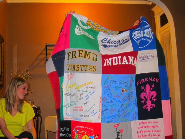 That’s the best bachelorette gift ever! I’ve actually been collecting my T-shirts over the years–from every sports tournament and competition in high school and college, not every half and full marathon–to do the same.
