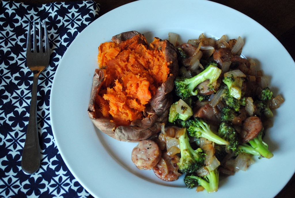 Dinner last night featured chicken sausage, onion and broccoli sautéed in coconut oil and served with a sweet potato.