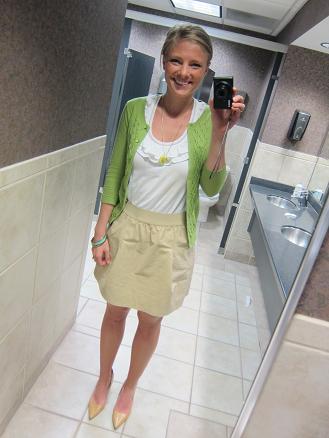 I LOVE the skirt Julie!! Especially with the bright cardigan. Great outfit! 🙂