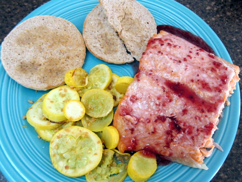 Gift unwrapping was preceded by dinner which included Ryan’s favorite salmon with a raspberry glaze, roasted summer squash and a side of garlic bread that I made by topping a whole wheat sandwich thin with butter and garlic salt.