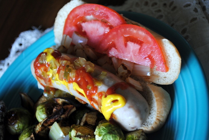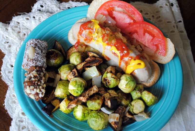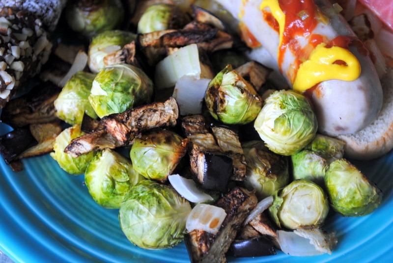 I cooked up an all natural al fresco apple chicken sausage while sautéing an onion and roasting Brussels sprouts and eggplant.