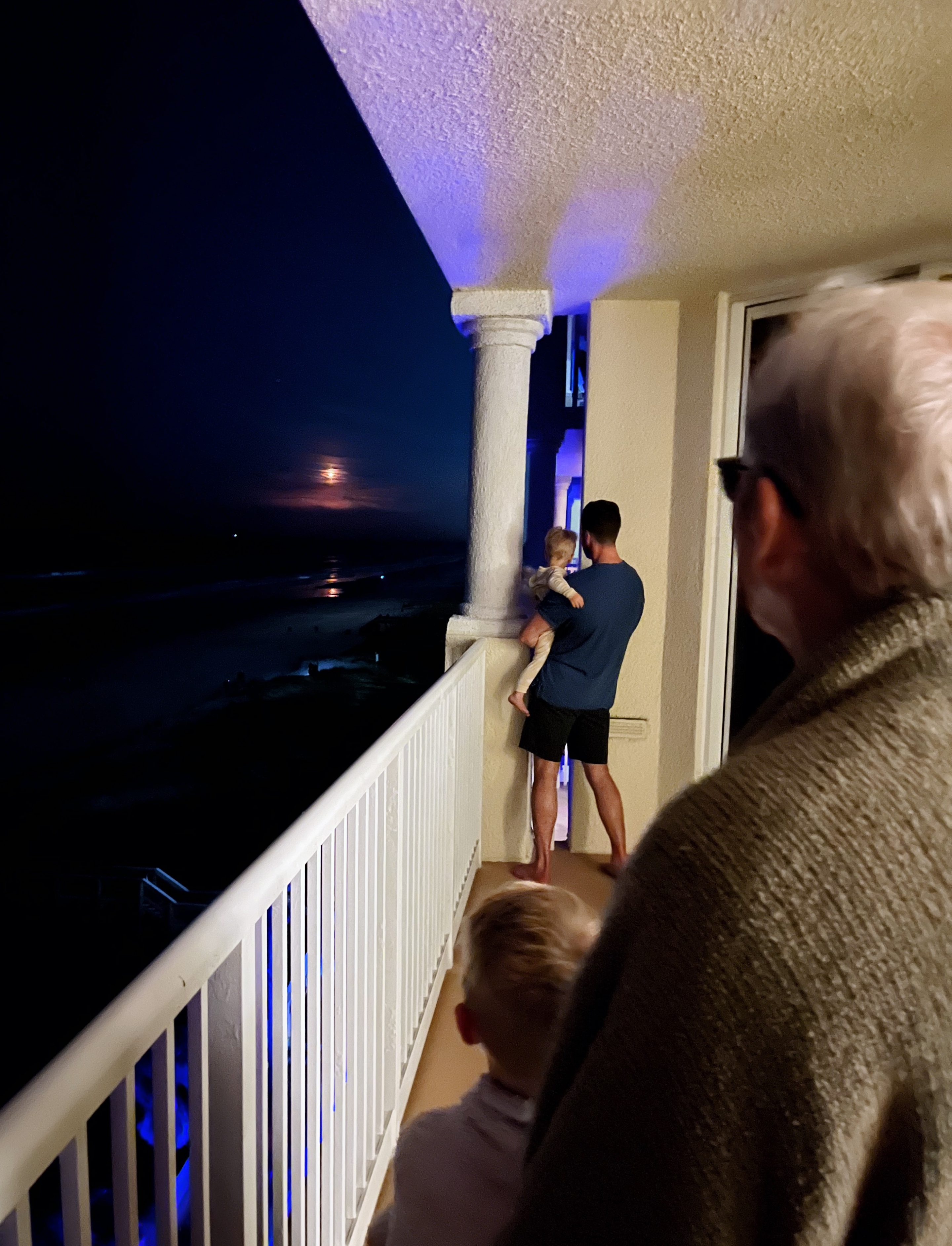 One major highlight from our time in Florida was the fact that our whole crew got to see a night launch from the balcony of my parents’ condo. My mom is big-time space fanatic and frequently texts our family with updates about the moon, rocket launches, etc., so she had the launch streaming on her phone so we were able to participate in the countdown and then search the horizon for the rocket.