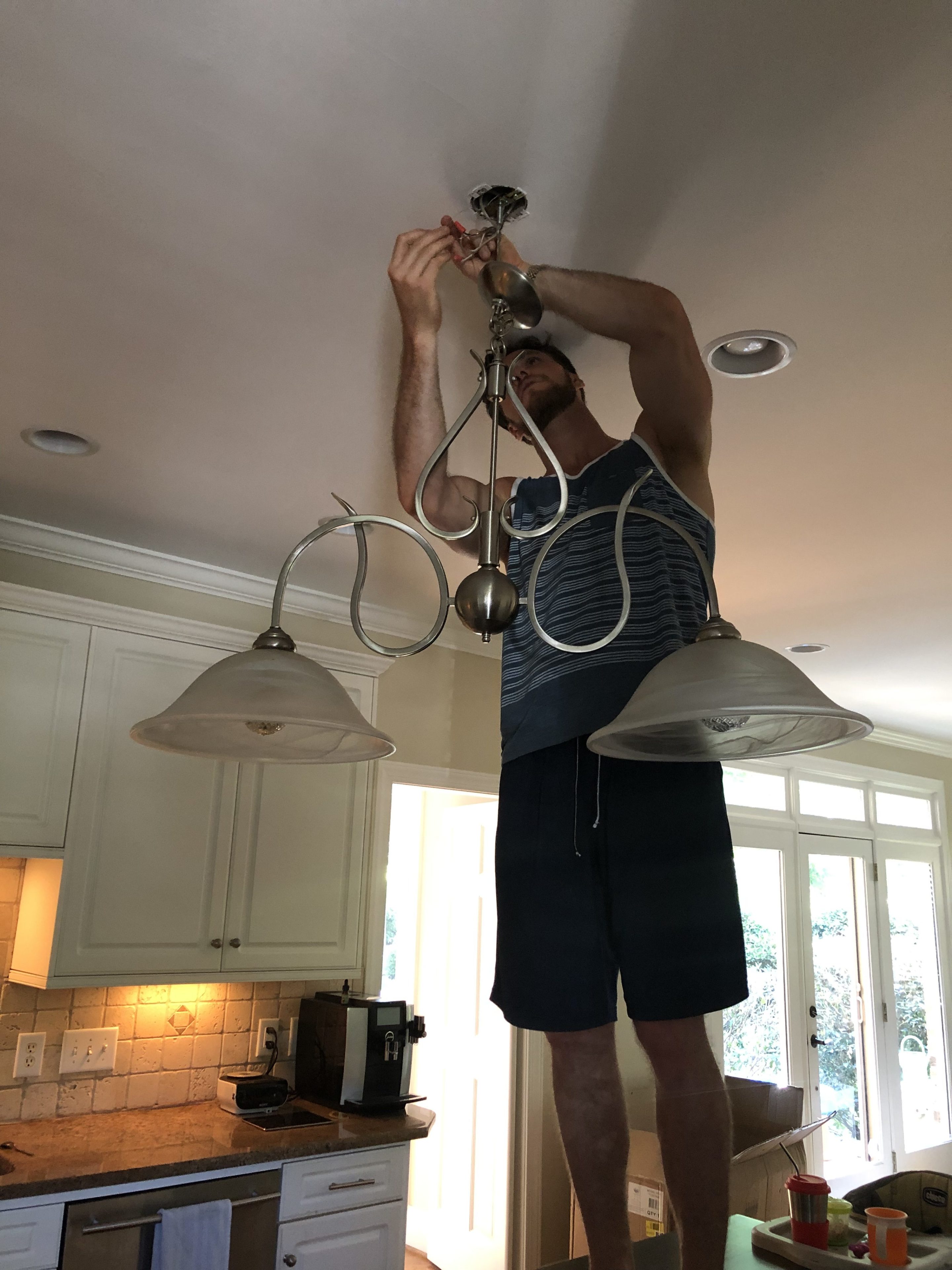 Ryan arrived home right around the time Ryder woke up from his morning nap. While Chase and Ryder played with a ball in the family room (Ryder’s latest skill is rolling a ball back and forth and he’s obsessed), I coerced Ryan into helping me hang the new kitchen island light I ordered on major sale through Wayfair and I am in LOVE with it!!
