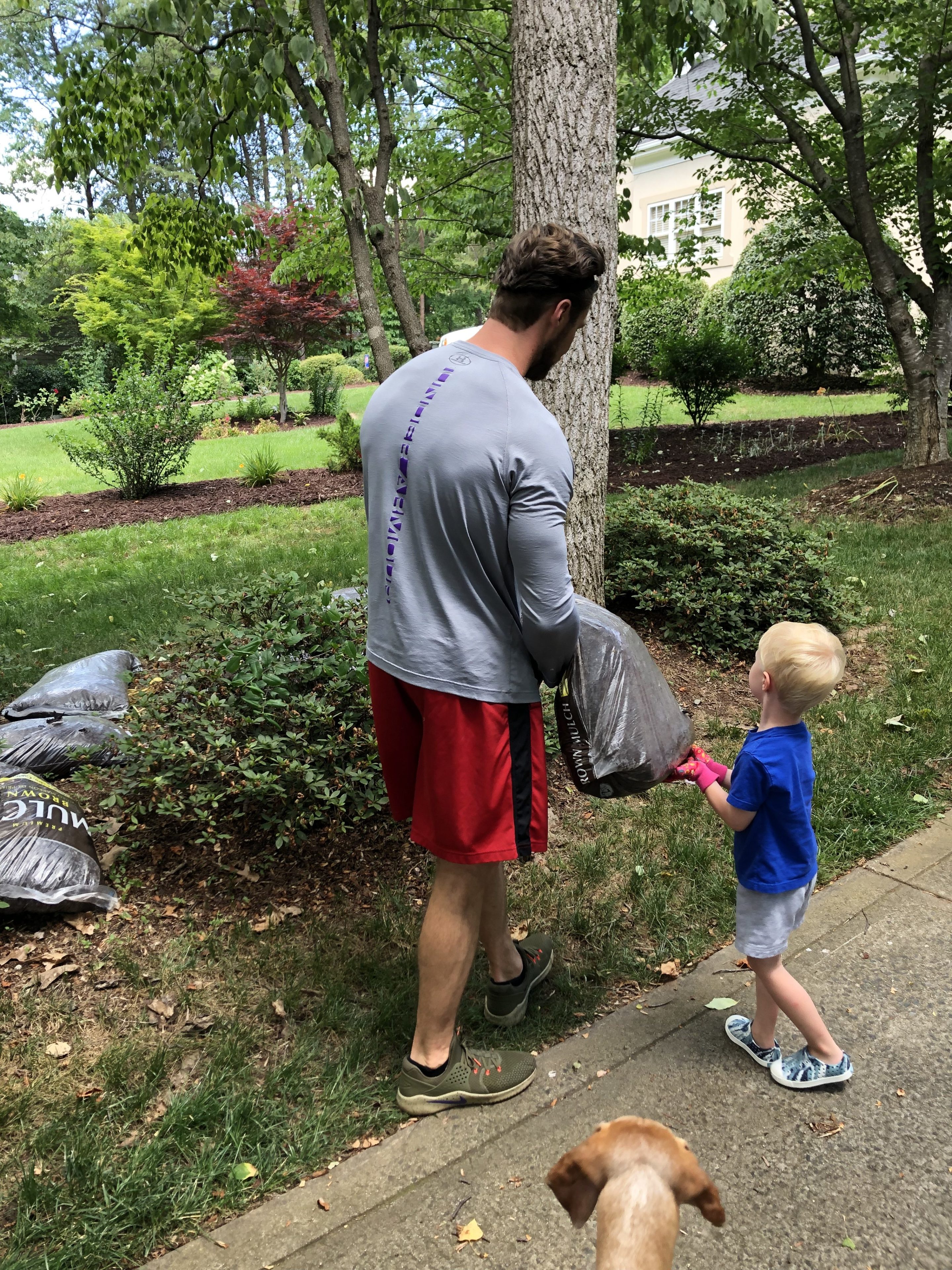 Chase looks for any excuse to wear his gardening gloves and “helped” us put down some mulch before digging for worms. The rest of the evening looked like dinner, bath time and early bedtimes for everyone!