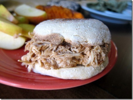 Today’s microwaved sweet potato was enjoyed with a BBQ pulled chicken sandwich served on a toasted English muffin with a side of apple slices. I was really hoping for some peanut butter to dip the apples in on the side, but we’re all out. The horror!