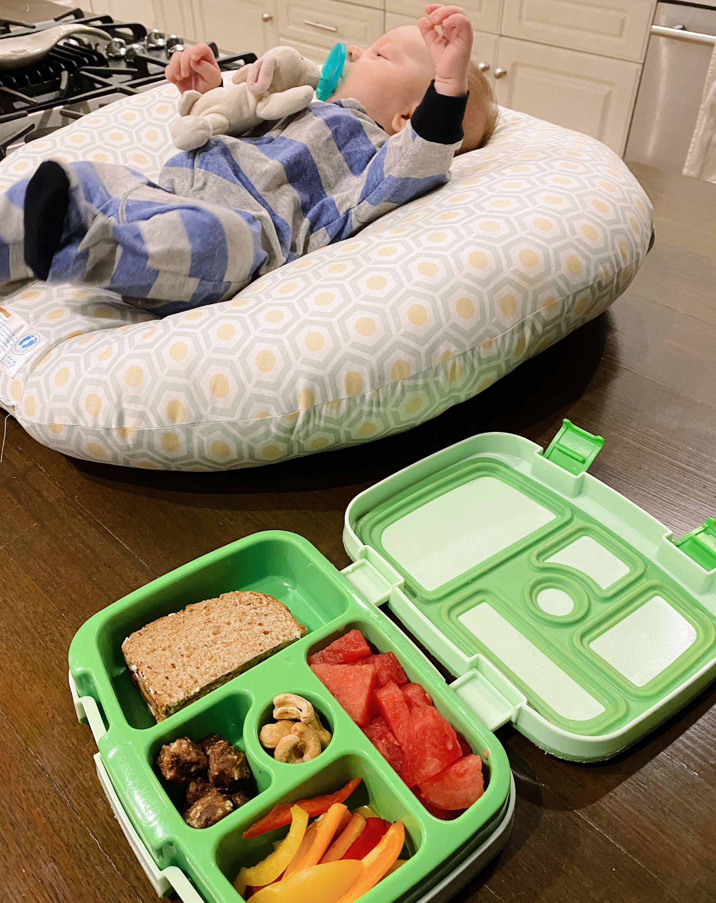 I tried my best to nurse and rock Rhett back to sleep but after placing him in his bassinet only to have his eyes immediately fly open, I threw in the towel and pulled him into bed with me for some morning cuddles until we headed downstairs. Rhett supervised breakfast 1.0 (peanut butter on a piece of bread) and preschool lunch-making and we hung out together until Ryan was done with his workout.