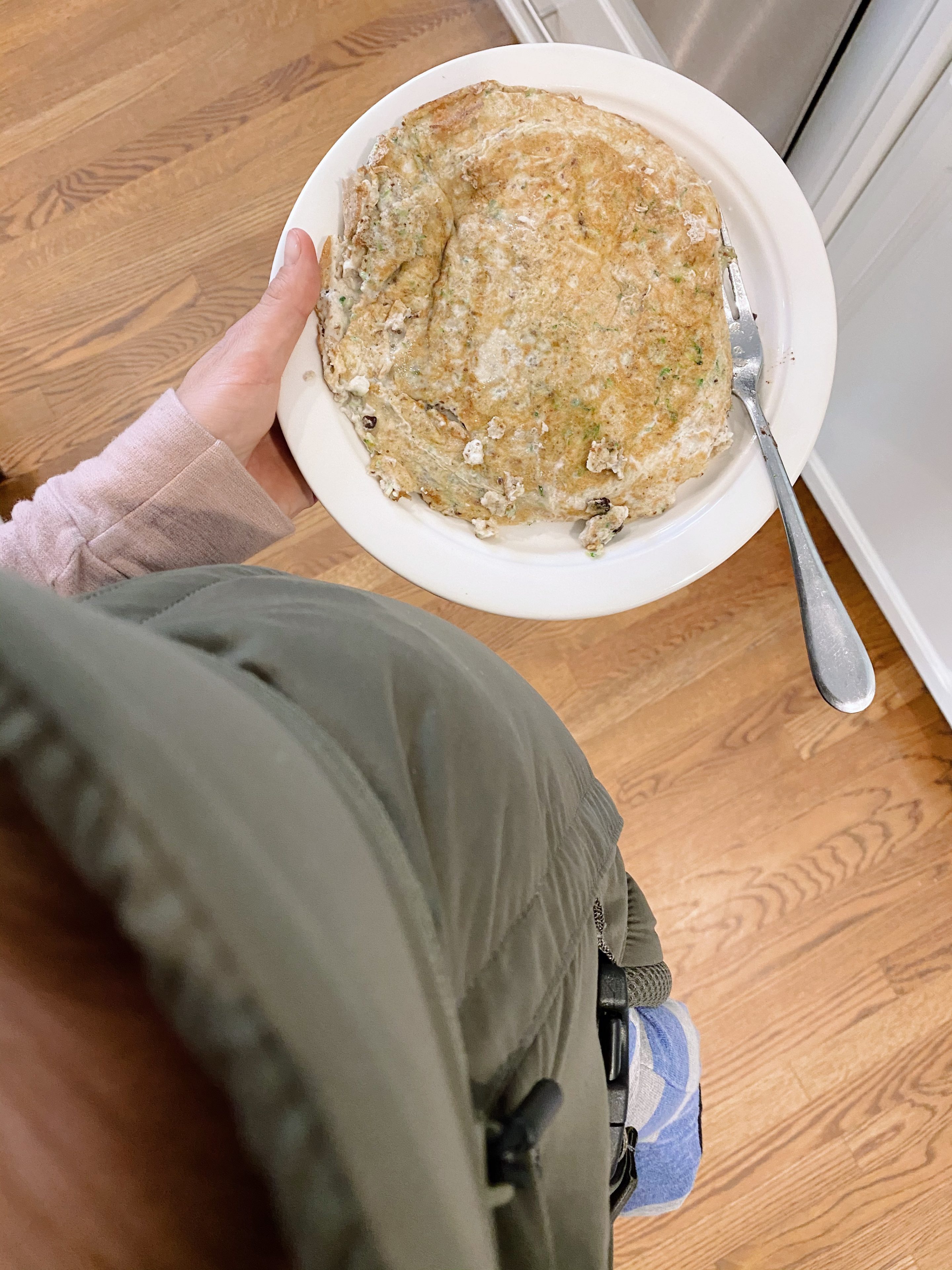 Once we arrived back home, I left a sleeping Rhett in the carrier and made myself an egg white and oatmeal protein pancake with shredded zucchini, cacao nibs, ground flaxseed and raw pumpkin seeds added to the mix and ate it standing up and rocking around to keep Rhett nice and happy.