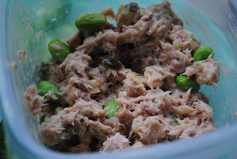 Today’s meal included tuna salad made with one can of tuna, light Miracle Whip, mustard, edamame and sweet corn.