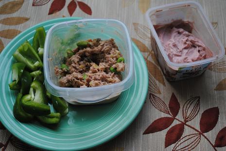 Along with the fishy salad, I also enjoyed a freshly sliced green pepper and a cup of chocolate yogurt mousse.