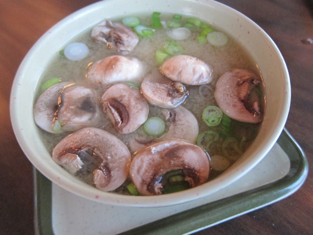 Miso soup is so good- especially when it has sliced mushrooms! I always order some miso because “mi so hungry!” [my fiance and I always get a kick out of our oh so bad jokes :P]