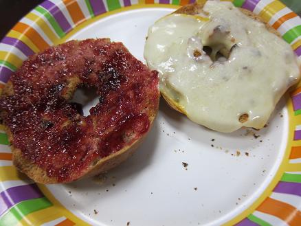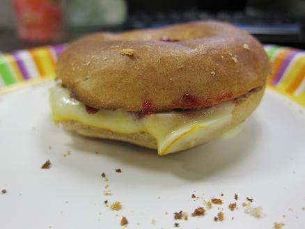 Today’s bagelwich was prepared on a toasted cinnamon Alternative Bagel (I buy them at Publix), topped with melted muenster cheese and raspberry jelly.