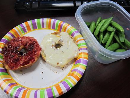 The bagelwich won the MVP of this meal, hands down. Pretty sure peas can never compete with cheese, so it wasn’t really a huge upset. 😉
