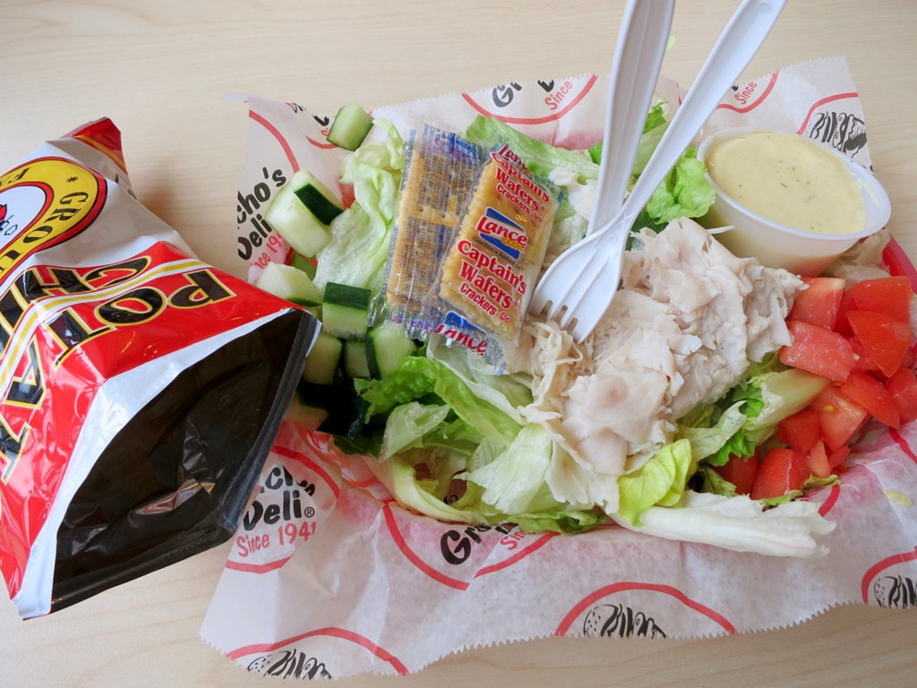 On the drive over to the deli, I snacked on one too many handfuls of yogurt-covered almonds I had stashed in my purse, so by the time we arrived, I wasn’t all that hungry and actually felt a little blah. Fail. I still knew I needed to get something protein and veggies in my belly (you know, something other than sugary almonds), so I ordered a salad with honey mustard dressing and a small bag of chips on the side.