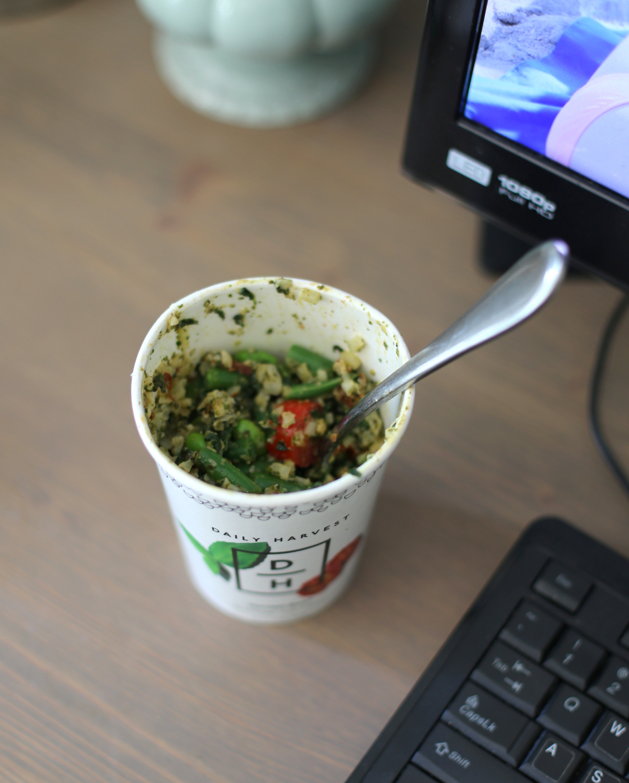 My lunch for the day took place in two parts. Part one: My favorite Daily Harvest cauliflower pesto harvest bowl (I added frozen edamame, chopped green beans and some brown rice to it for volume) + Part two: A teriyaki salmon burger