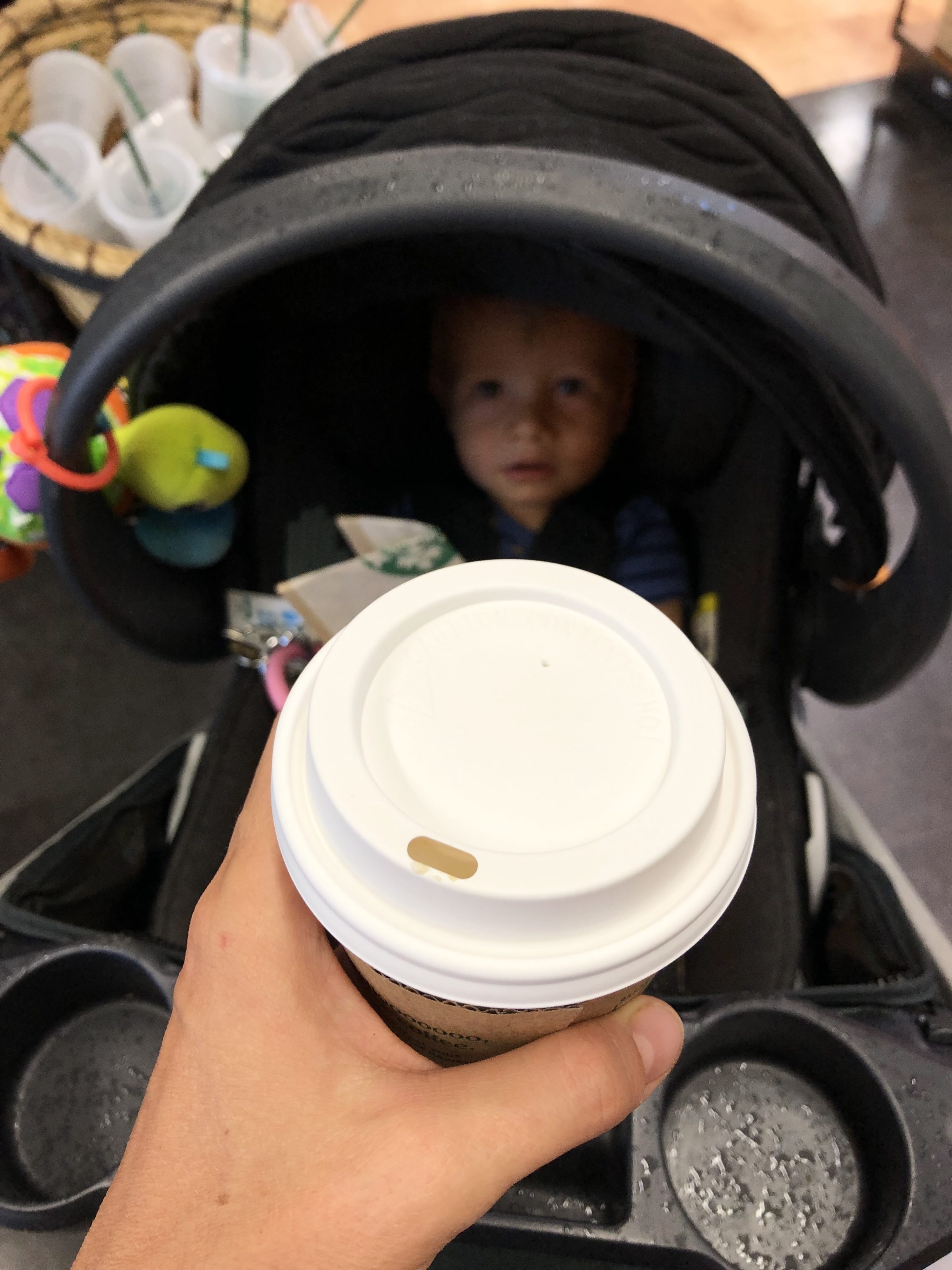 Since there is a Starbucks located in the front of the grocery store closest to Chase’s summer camp, I treated myself to a whole milk cappuccino and a spinach feta wrap for breakfast as well. (The boys ate strawberries and sweet potato muffins at home.)