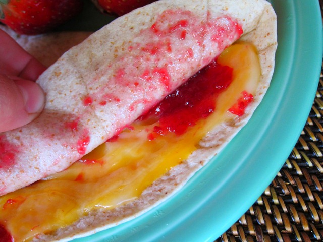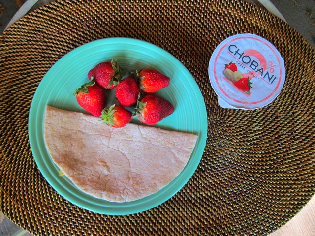On my plate: A tortilla microwaved with Colby jack cheese and a smear of raspberry jelly, along with fresh strawberries and a cup of strawberry banana Chobani Greek yogurt.