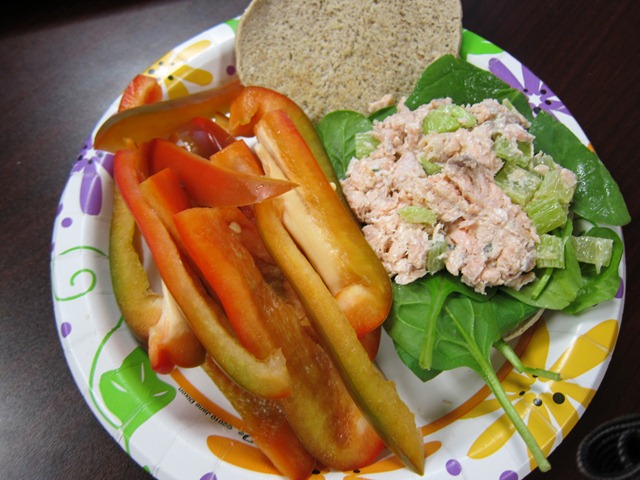 Today’s lunch included salmon salad on top of a toasted sandwich thin.