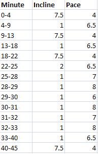 I completed a 45-minute workout on the treadmill that looked a lot like my Lazy Girl Workout from Saturday. I changed up the end a bit to make it a little more challenging and incorporated five extra minutes of running. In the end my workout looked like this: