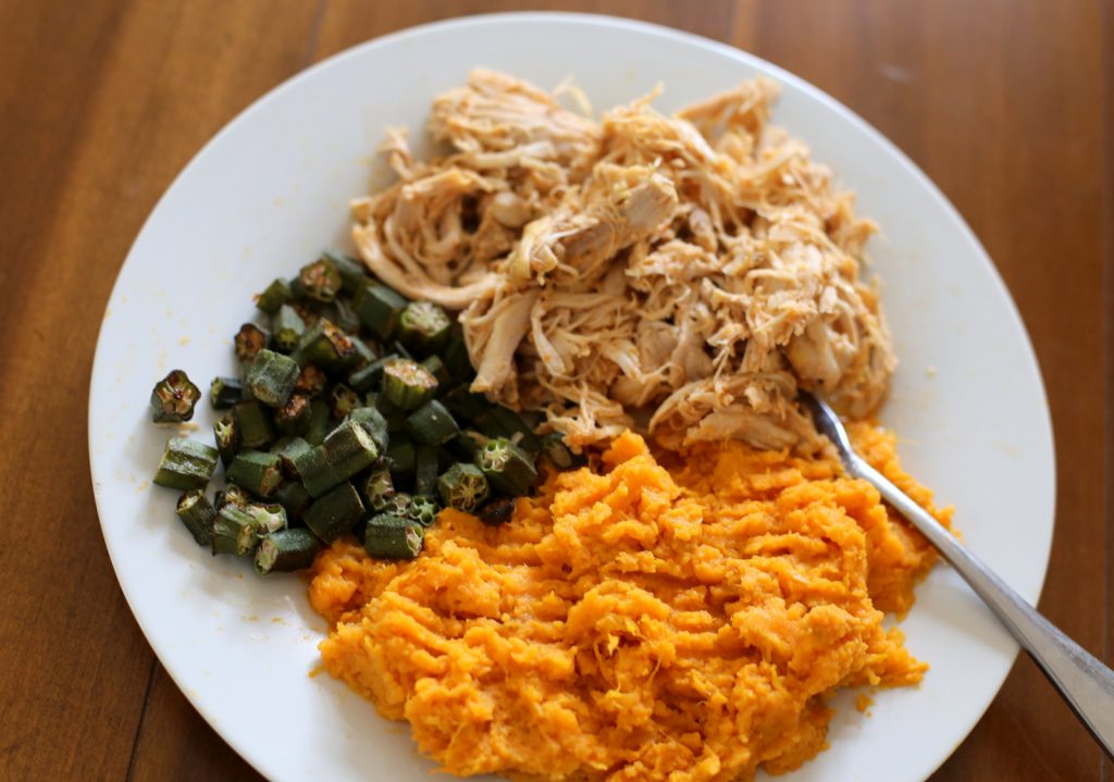 Monday: Instant Pot BBQ Pulled Chicken (via Meatloaf and Melodrama) with Roasted Okra and Mashed Sweet Potatoes