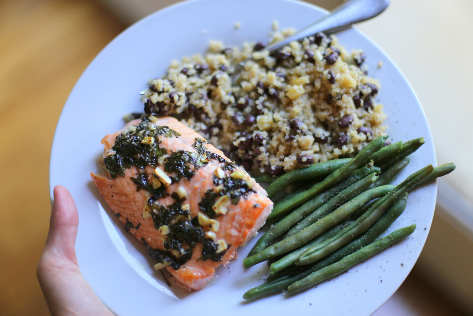 Thursday: Cilantro Lime Salmon (via Creme da la Crumb) with Black Beans, Quinoa and Steamed Green Beans