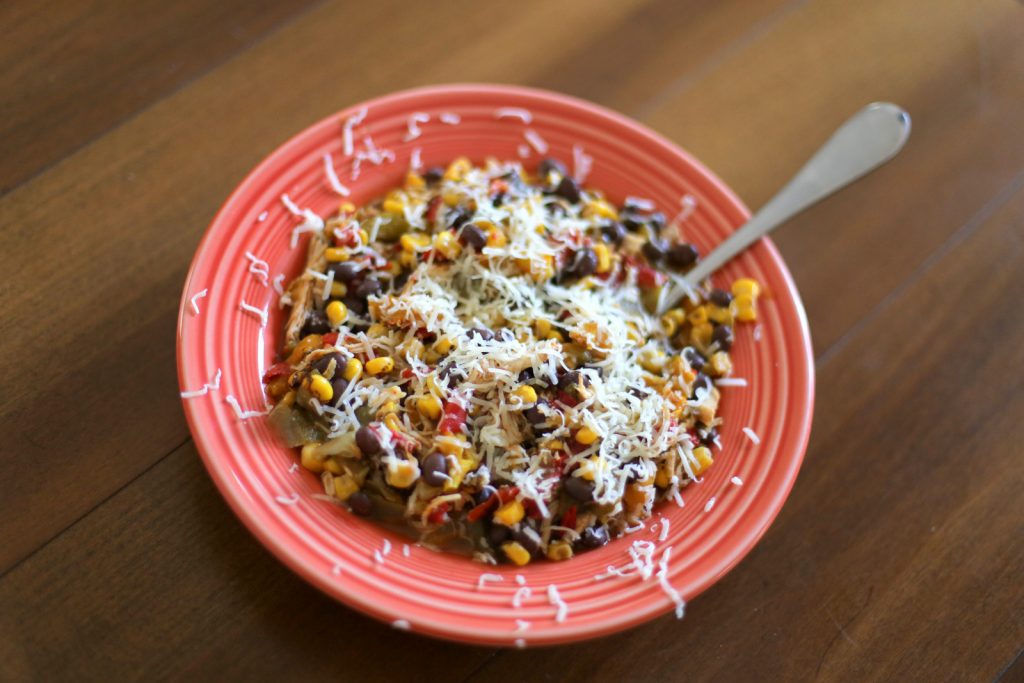 This meal came together in a hot second thanks to leftovers and freezer food. I quickly sauteed frozen bell peppers in butter before adding frozen fire-roasted corn, a can of (rinse + drained) black beans and leftover pulled chicken to the skillet. I seasoned everything with Fajita Magic seasoning (<– LOVE this stuff for short-cut fajitas or a pop of southwest flavor) and topped our fiesta bowls with freshly-grated cheese. It was a dinner winner and took less than 10 minutes to throw together.