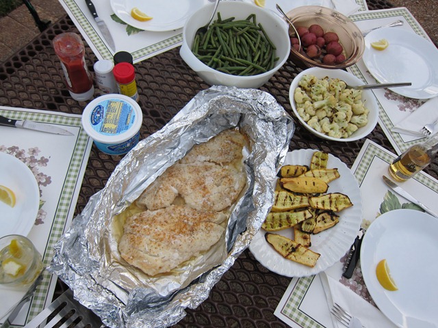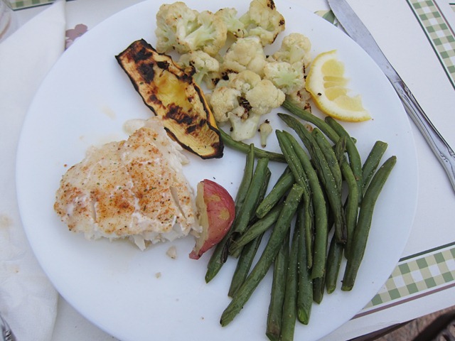 While the guys snapped green beans, my mom prepped the fish and I prepared cauliflower for roasting and squash for grillin’.