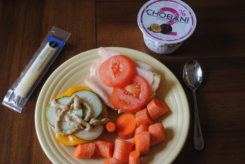 My meal included a cheddar cheese and turkey bagelwich, served with string cheese, carrots and a cup of passion fruit Greek yogurt, a new flavor recently introduced by Chobani that the company sent me to try.