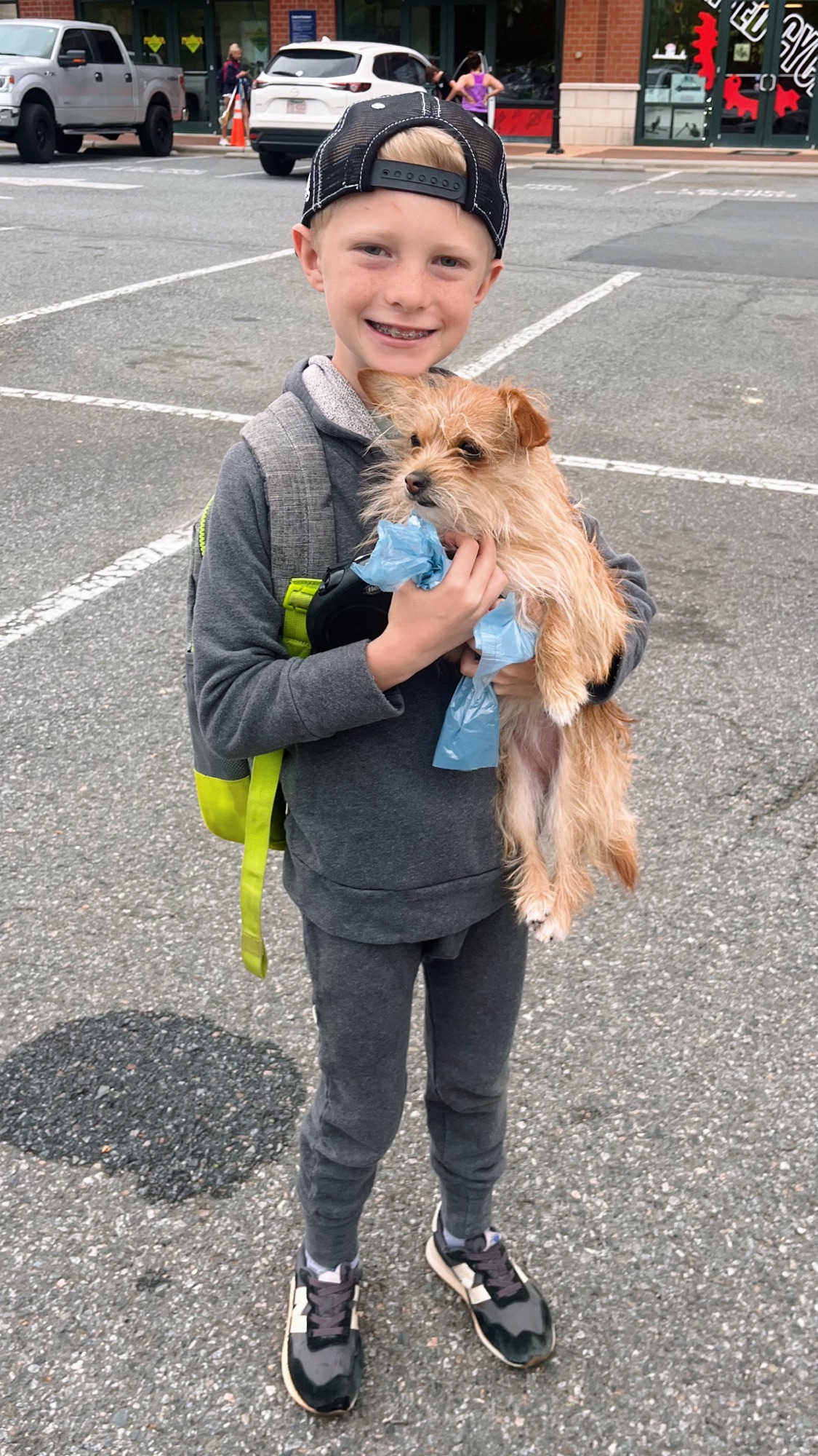 Soon after breakfast, we piled into my car to take Chase to school. No one was more excited for school drop off than Pepper! She dashes to the door when she knows it’s time for us to leave and always likes to be in the mix. I’ve said it before but I’ll say it again: This tiny hamster dog has been the perfect fit for our family. She’s seriously the source of so much joy, humor and love in our lives every single day and the way she is with our boys will forever be one of my very favorite things about her. Dogs are just the best.