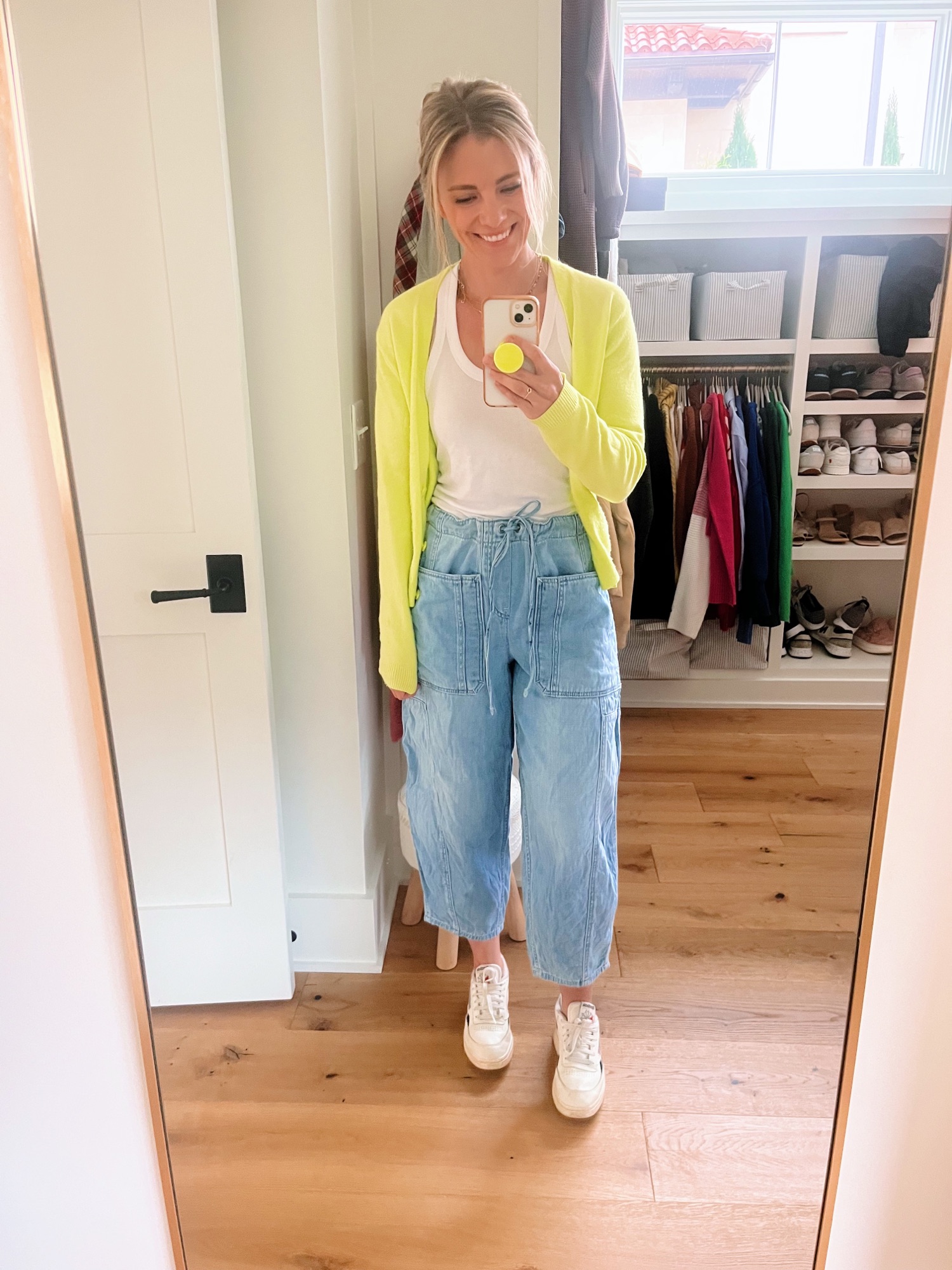 (Cardigan: Target but old / Tank: Old Navy but old / Jeans: Free People / Sneakers: Reebok / Colorful Beaded Necklace: Amazon / Tiny Heart Gold Necklace: Gorjana)