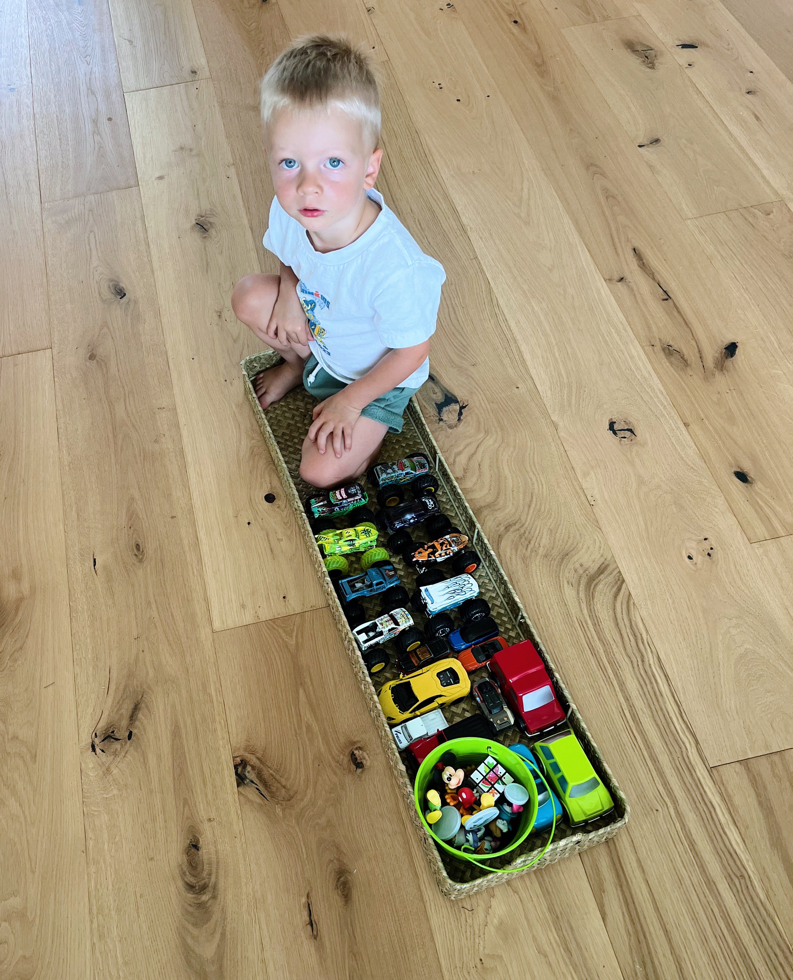 4:45 p.m. We’re back home and the kids are unwinding with some playtime, podcasts and snacks. Rhett found my most recent Target purchase and decided to hijack it and turn it into a “boat” to transport his toys to the “beach.” Can you tell he thought I was going to take it back when I whipped out my phone to take a picture of him?