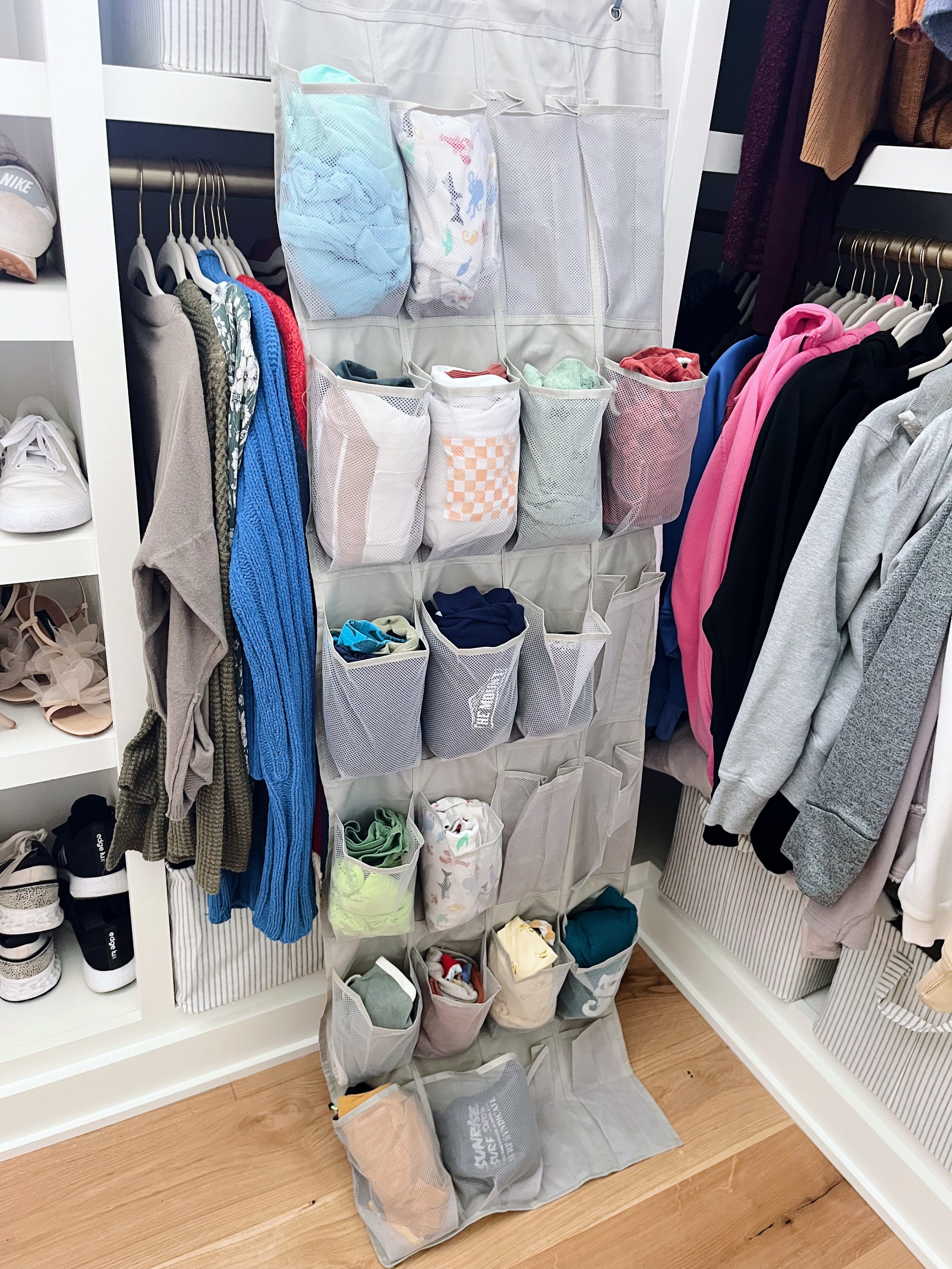 1:20 p.m. I’m in full-on packing mode thanks to a new system I’m trying for the first time. Have you guys seen the trend on the internet where people pack their kids’ clothes in hanging shoe organizers? You’re supposed to pack individual outfits in each shoe spot and then roll all of it up and pack it into a suitcase. Once you get to your destination, you unroll it, hang it on a door and have all of your kids’ outfits all planned and easily accessible. Two of my girlfriends did this for their summer vacations and swore it worked like a charm so here I am doing the same thing and hoping for the best. I’ll report back!