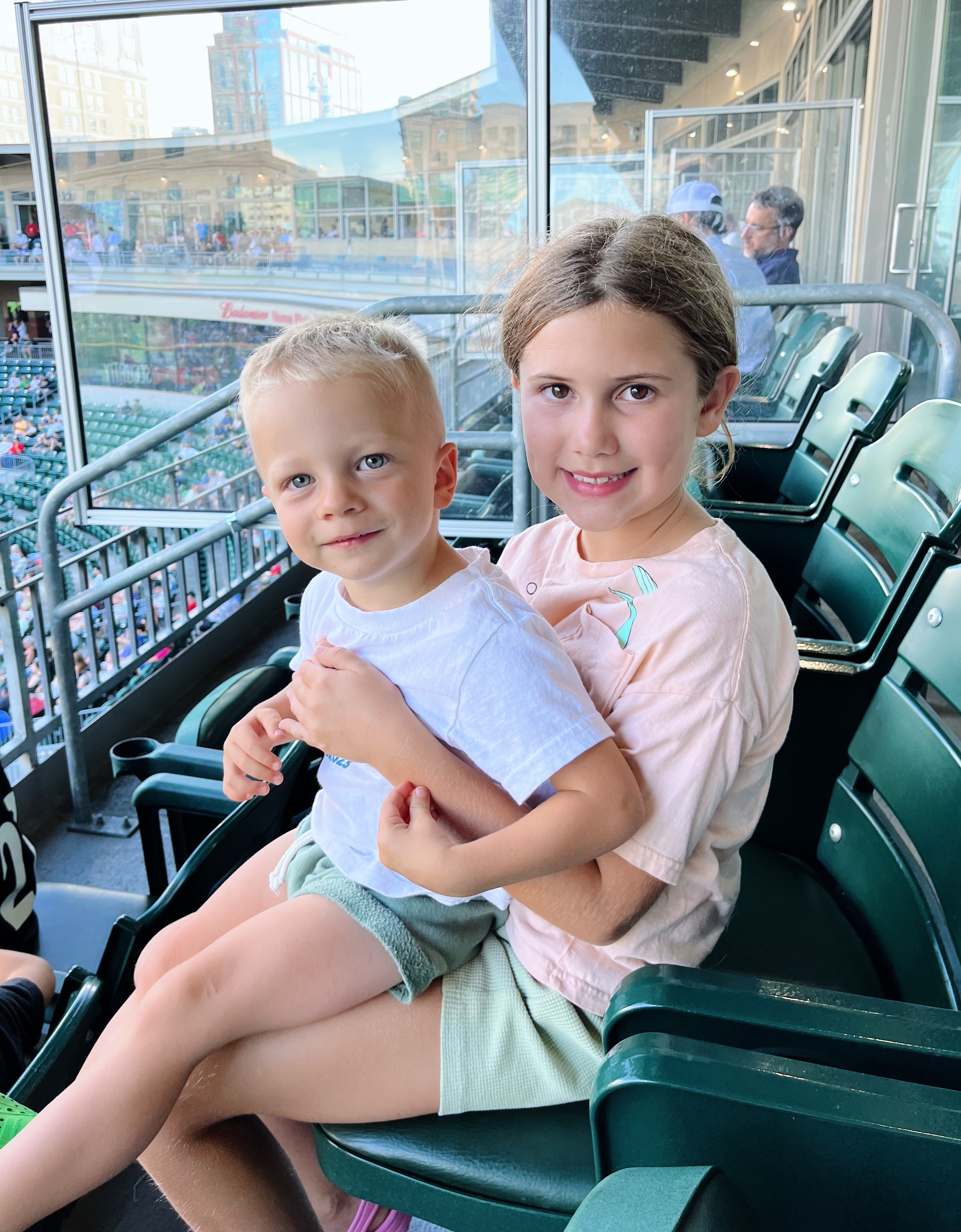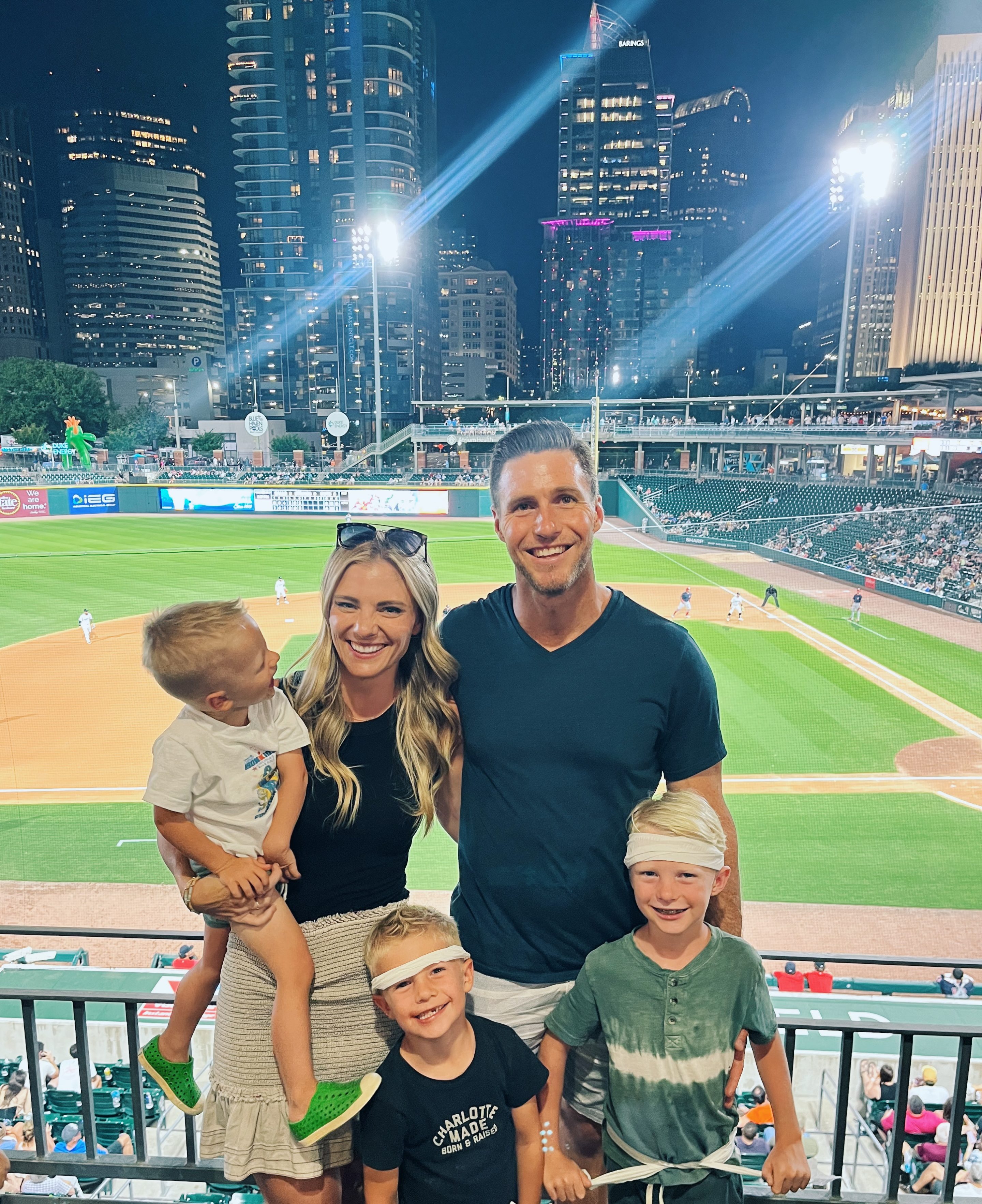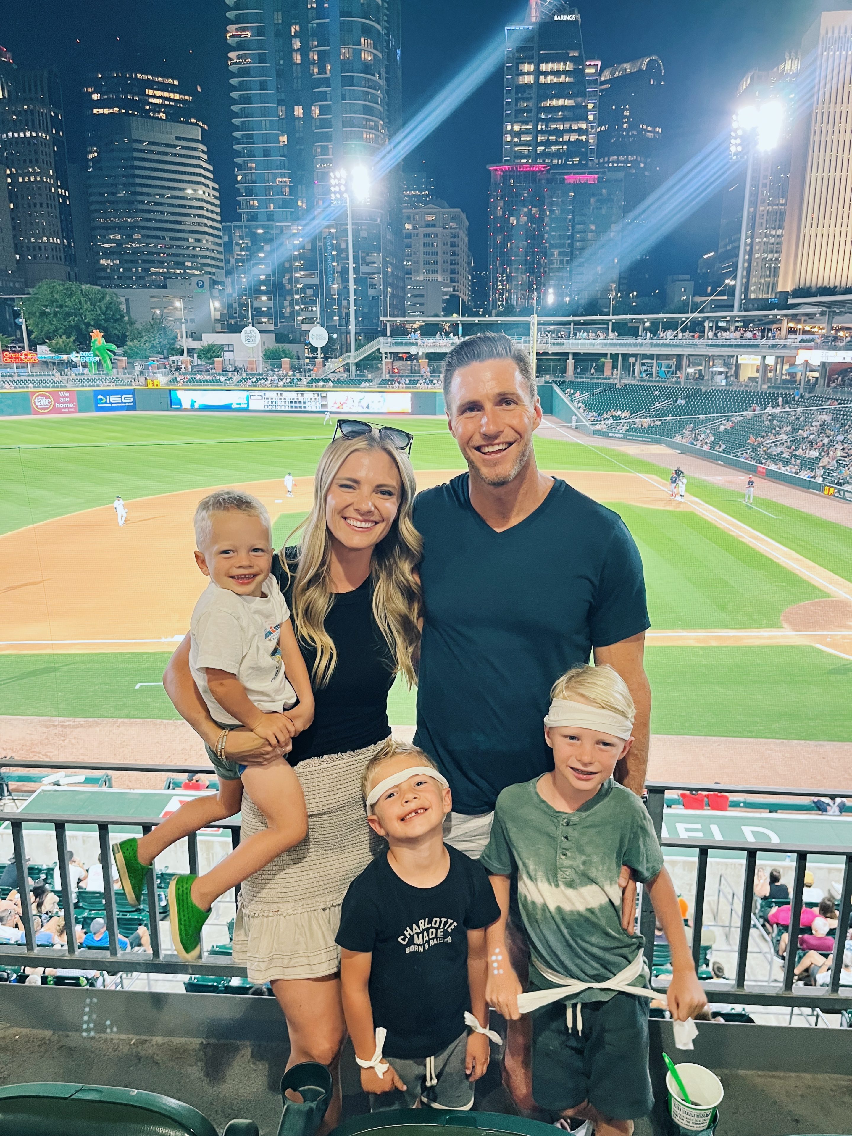 9:15 p.m. We snapped a quick family picture before we figured we should all head home and put our kids to bed. Summer nights mean some late nights for special occasions and we initially worried a bit about how Rhett would hang in there during an evening baseball game but he was living his best life. He smiled so much, saying “I at a baseball game! It very late! Look how dark outside!” You better believe he stayed fully awake during the whole drive home, too. He wasn’t going to miss a second of the fun, that’s for sure!