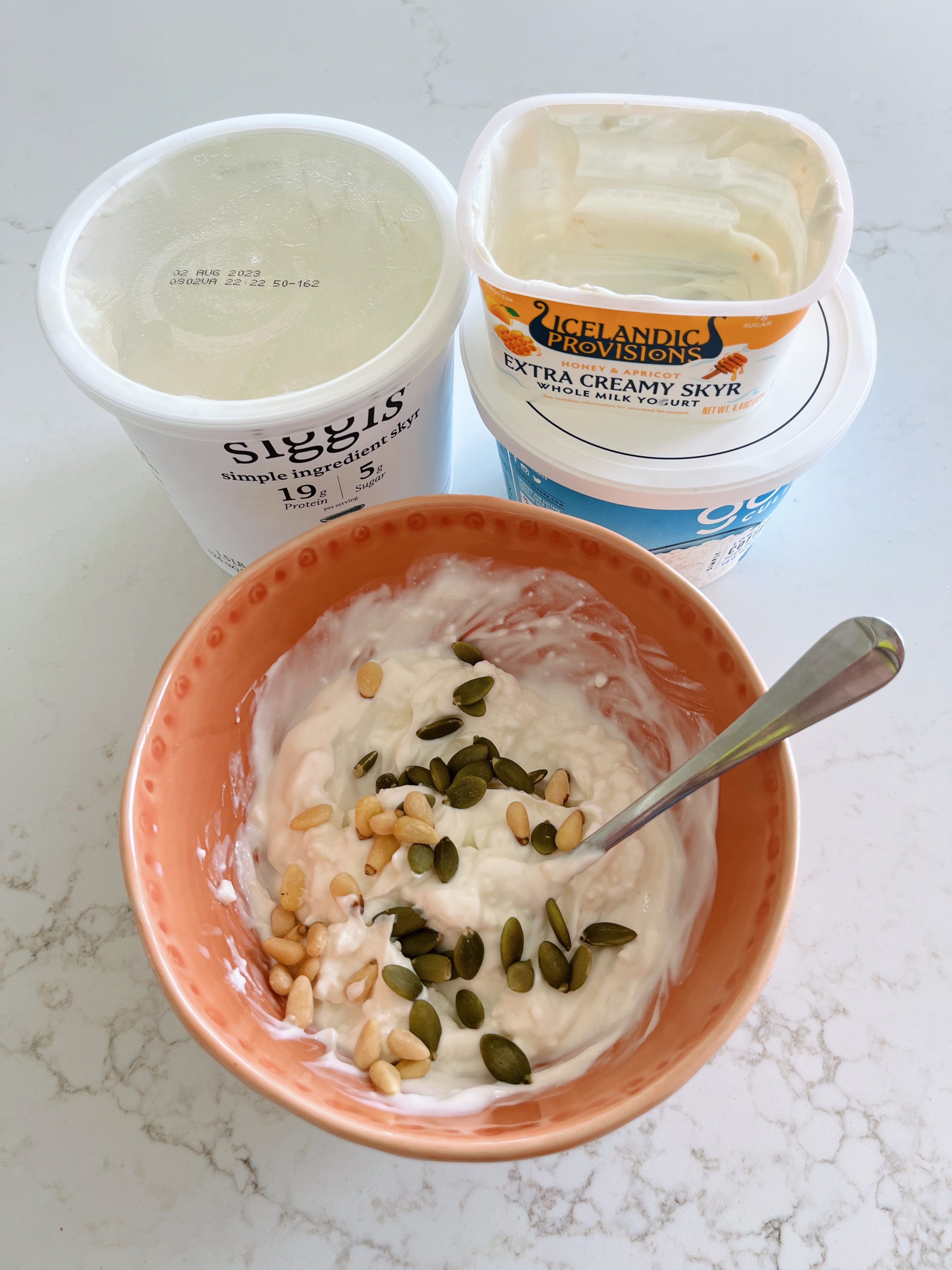 7:10 a.m. Everyone is up and dressed we all said goodbye to Ryan as he headed off to work. We spend a little time outside, walk Pepper up and down our street and then head inside for breakfast. I make myself a yogurt bowl with Icelandic Provisions extra creamy honey apricot skyr, Siggi’s plain skyr and Good Culture cottage cheese. Plus pine nuts and pumpkin seeds for a little crunch and healthy fats!