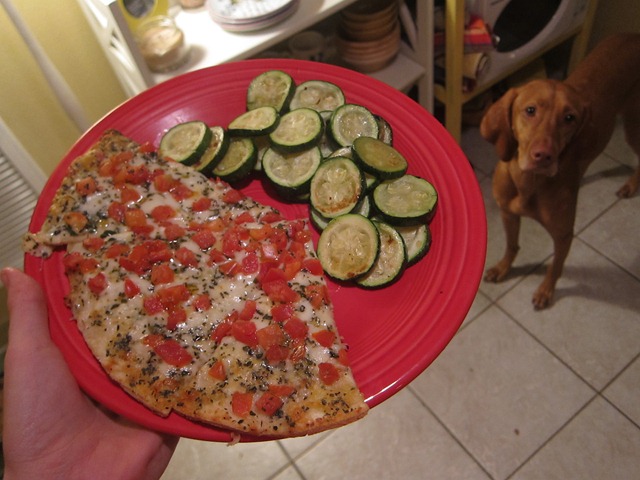 Our plates were full of food within 20 minutes thanks to thin crust frozen margherita pizza and roasted zucchini.pizza 019 pizza 021 I think Sadie wanted in.