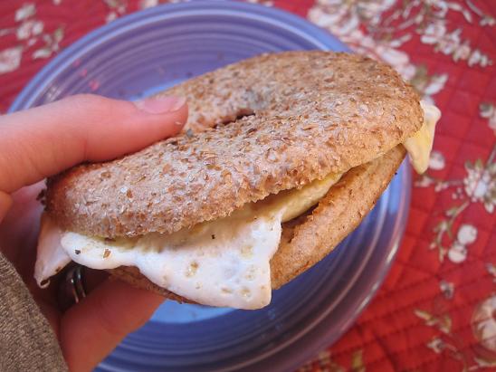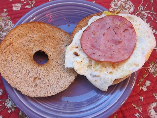 I made us egg sandwiches on whole wheat bagel thins with Canadian bacon and a thick smear of Laughing Cow light Swiss cheese.