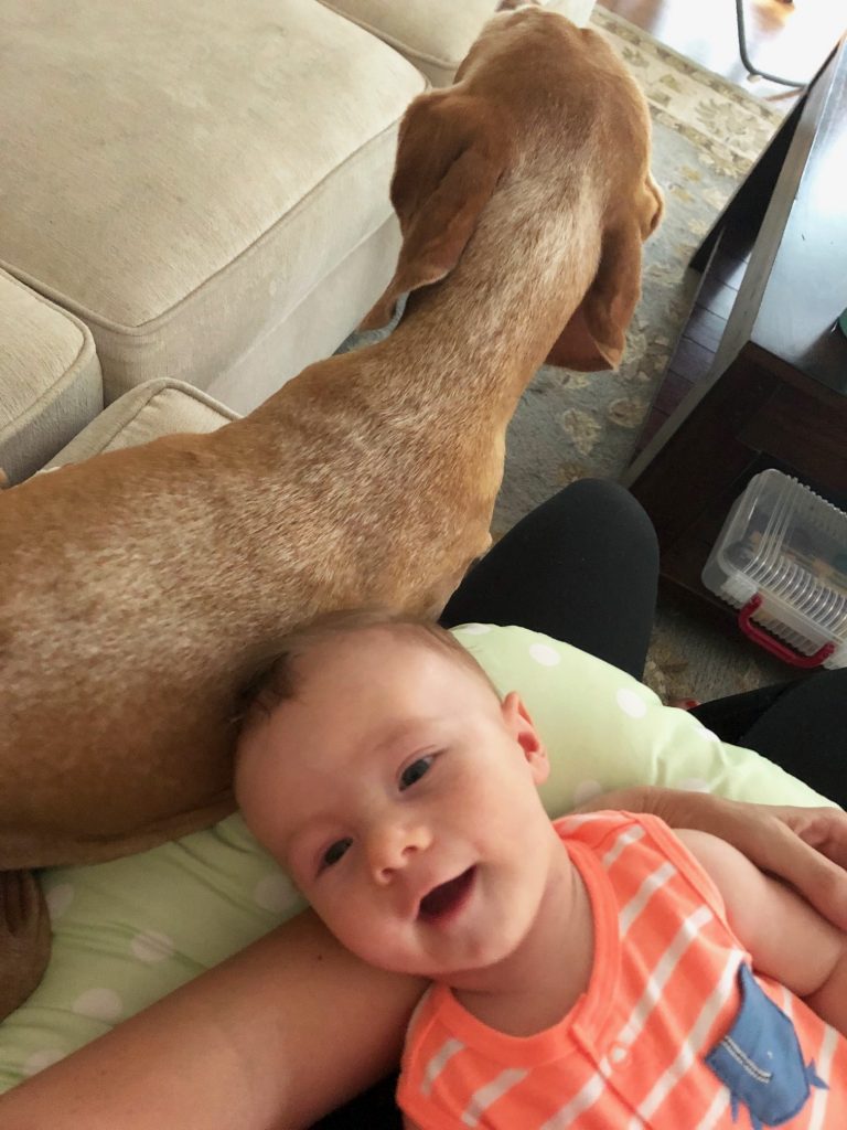 Aw Sadie! She is doing well!! Sadie admittedly had a rough adjustment when we brought Chase home from the hospital mainly because she was used to high-pitched voices being used only for her and the floor time that once signaled “go time” for doggie play suddenly often meant baby playtime, too. Plus, Sadie has never understood the concept of personal space and would legitimately sit her butt down on Chase’s belly when he was on the floor without realizing that certain things she could do with me or Ryan weren’t okay to do to a baby.