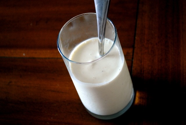 Before heading out to yoga, I made myself a small smoothie by blending up one and a half frozen bananas, a cup of Greek yogurt and a bit of milk.