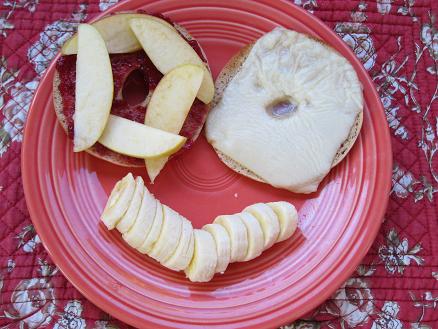 Today’s creation included a toasted cinnamon raisin bagel thin, topped with Swiss cheese, raspberry jelly and warmed apple slices. Banana slices rounded out the breakfast smiley face!