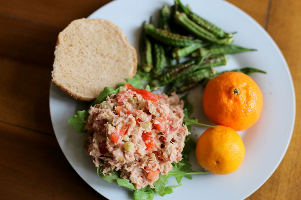 Yesterday’s lunch included a tuna salad sandwich (made with tomatoes, avocado oil mayo from Thrive Market, sweet relish and dijon mustard), roasted okra and two Halo mandarins.