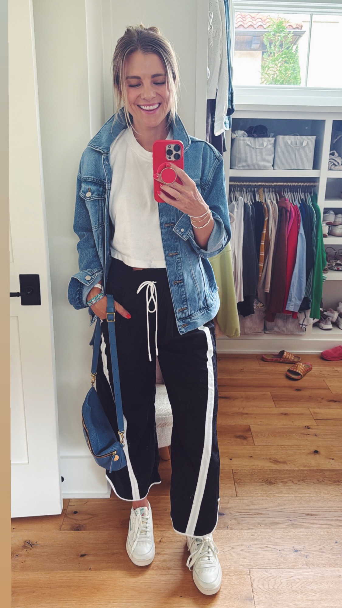 Outfit Details: Denim Jacket: J.Crew Factory / Track Pants: Amazon (wearing a medium)/ Tee: Nuuds (code JulieF10 saves 10%) / Sneakers: Reebok (The top-chalk color is the comfy color you can walk in for miles. The others fit differently which I learned the hard way!) / Bag: Clare V. / Thin Bead Bracelet Stack: Gorjana