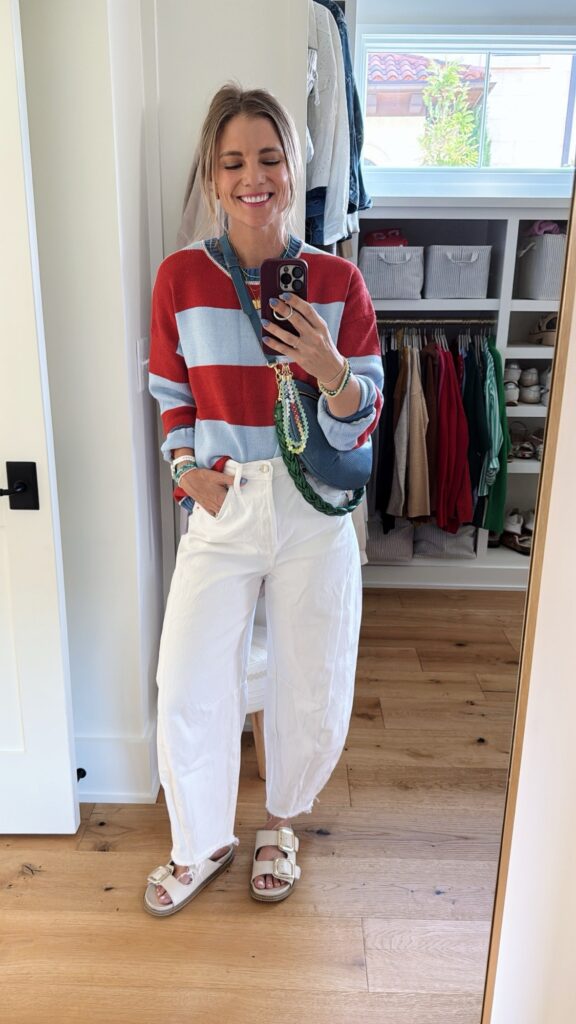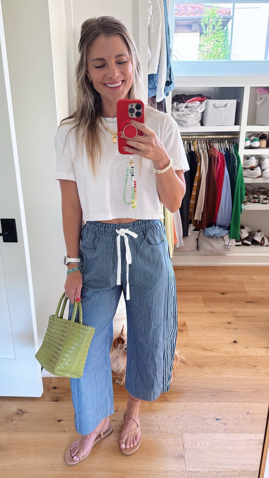 Outfit Details: Pants: Amazon (sized down to a small) / Tee: Nuuds (code JulieF10 saves 10%) / Sandals: Target / Colorful Bead Necklace: Amazon / Dog Tag Name Necklace: Tiny Tags / Tote: Madewell / Thin Bead Bracelet Stack: Gorjana
