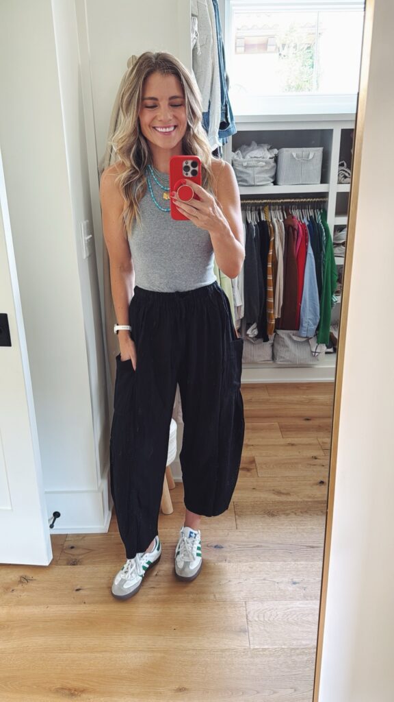 Outfit Details: Pants: Amazon (I sized down to a small — this is the “dark gray” color which looks different than it does in the online picture but I like it more!) / Bodysuit: Nuuds (code Julie10 saves 10%) / Sandals: Target / Bag + Straps: Clare V. / Dog Tag Name Necklace: Tiny Tags / Thin Gold Necklace: Gorjana / White Bracelet Stack: Amazon / Thin Bead Bracelet Stack: Gorjana