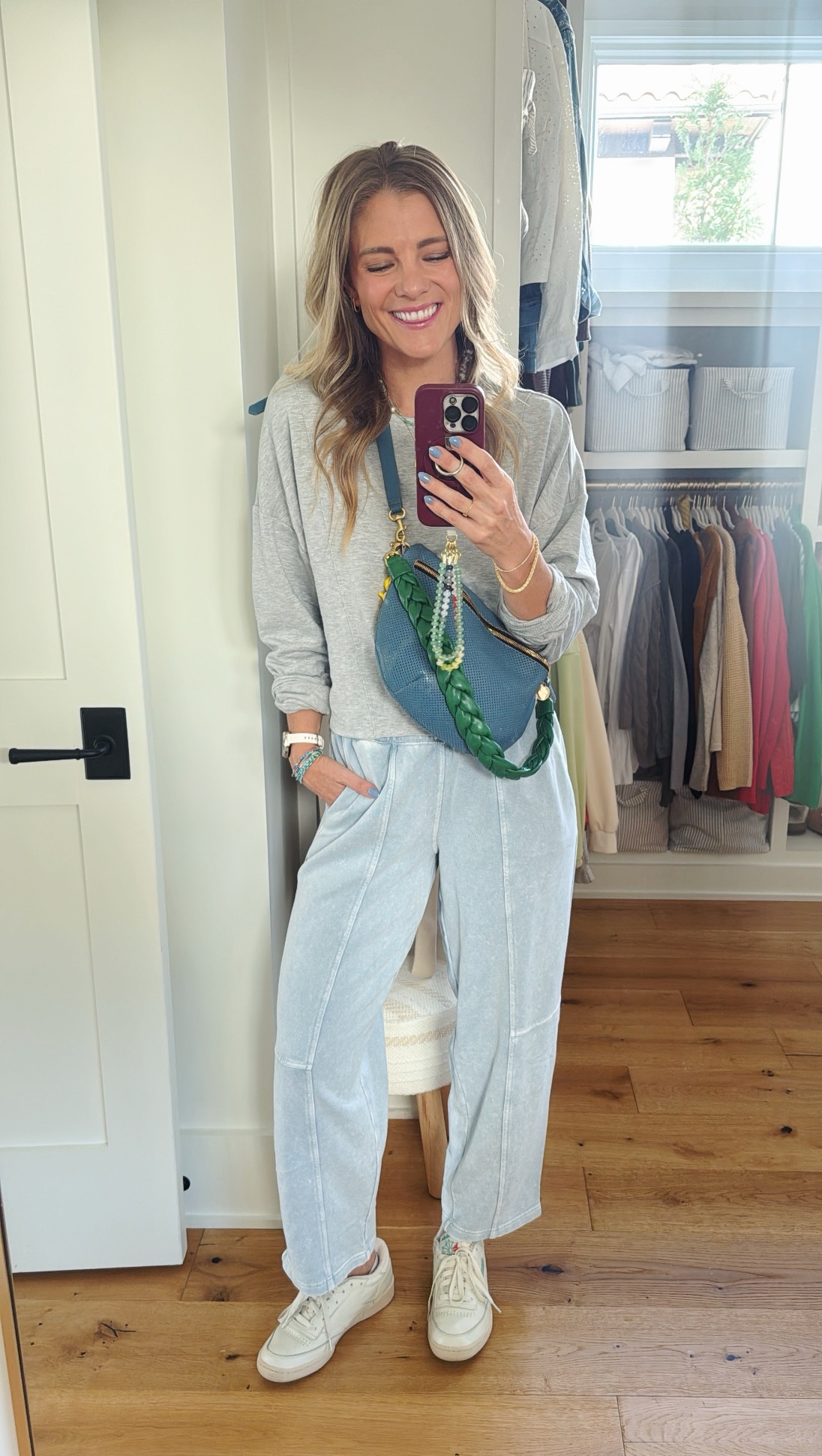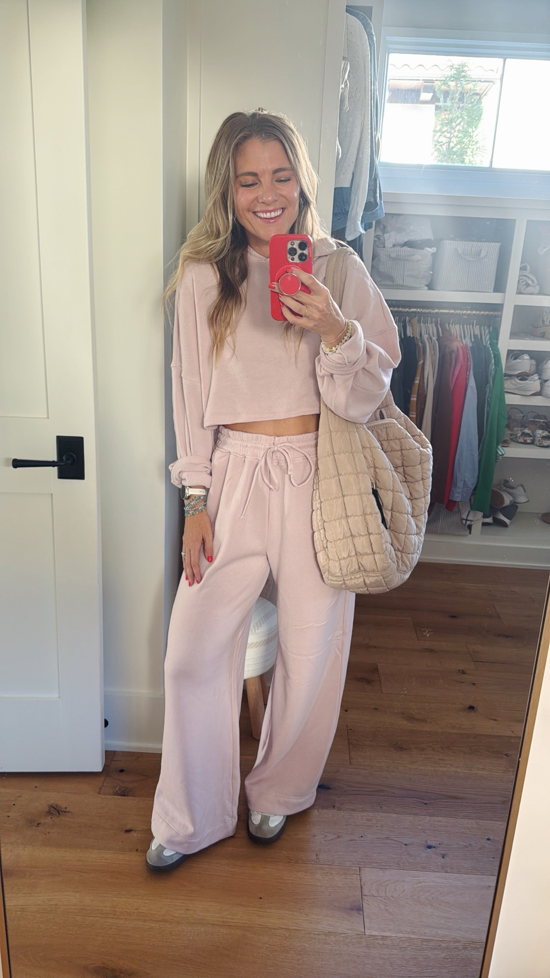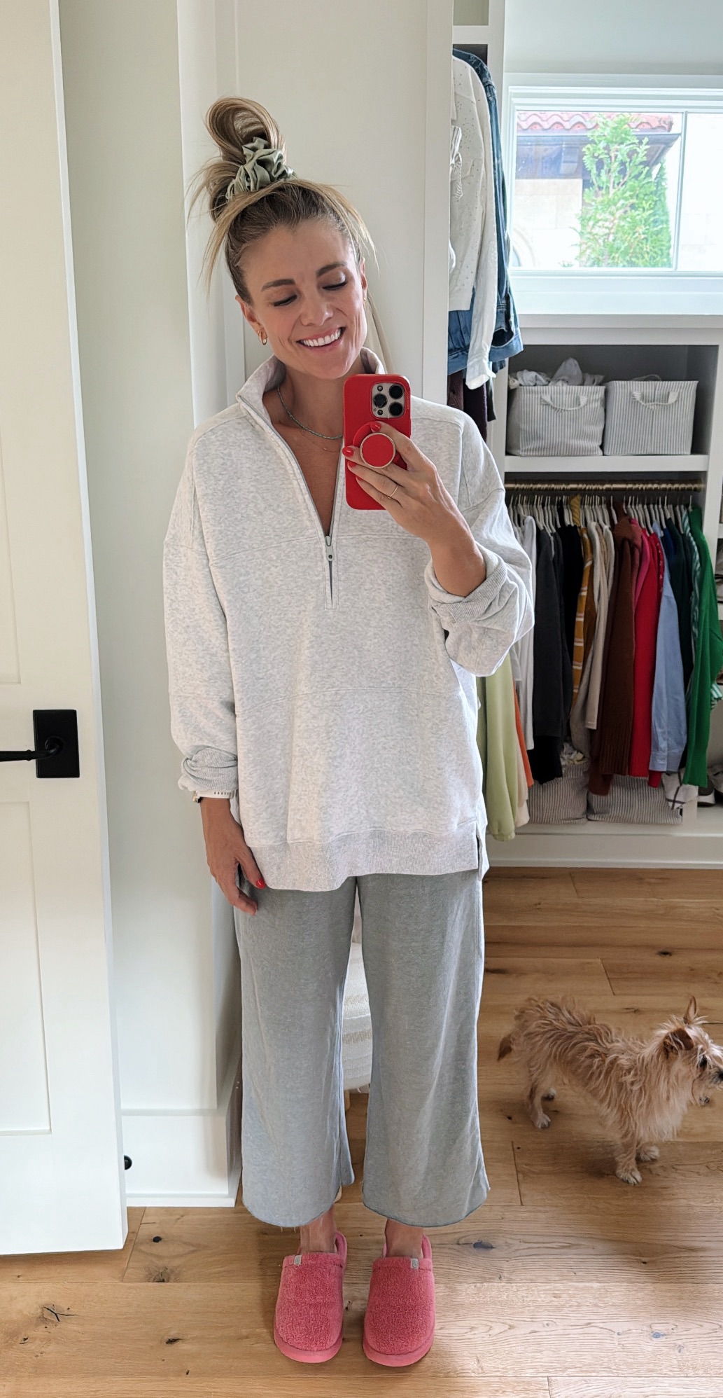 Outfit Details: Sweatshirt: aerie (sized up) / Wide-leg sweats: Amazon (in a medium) / Slippers: Brunch / Silk Scrunchie (I wear this every night to bed!): Crown Affair