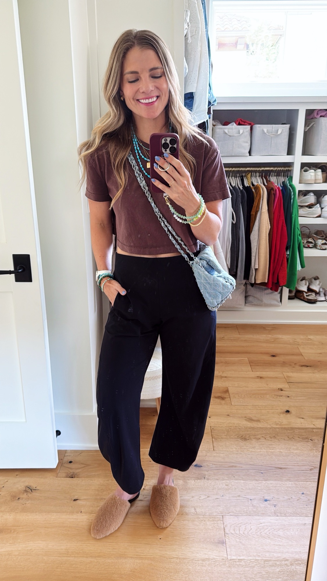 Outfit Details: Top: Nuuds (code Julie10 saves 10%) / Pants: Ruti / Shearling Mules: Jenni Kayne (currently free with a $150 Oak Essentials purchase!) / Dog Tag Name Necklace: Tiny Tags / Blue layered bead necklace: Bauble Bar / Bag: Talulah (but old)