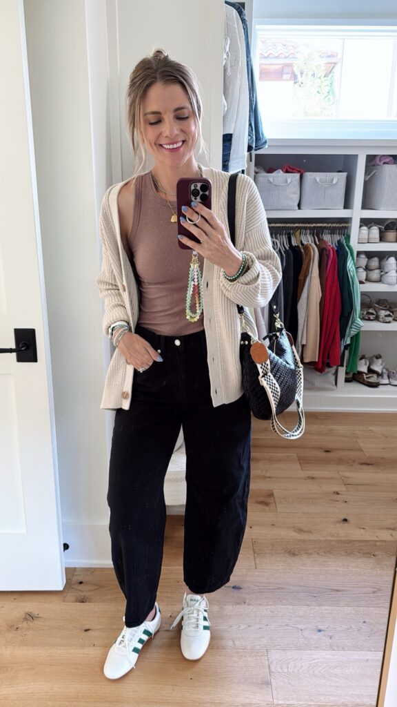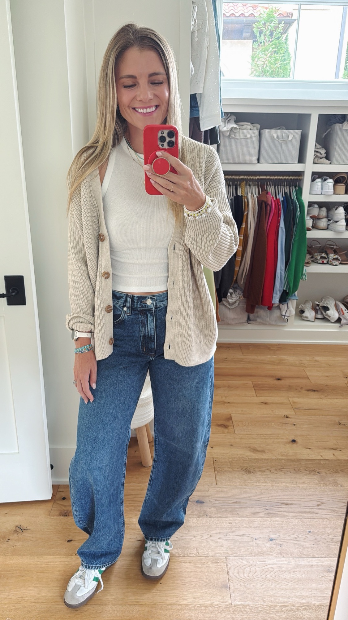 Outfit Details: Jeans: Target / Cardigan: Quince / Tank: Target / Shoes: Adidas / Bag: Clare V.
